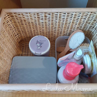 おむつやスキンケアグッズなどをとりいそぎ収納しました。実際のお世話スペースがどうなるかは生まれてからまた調整しようと思っています。