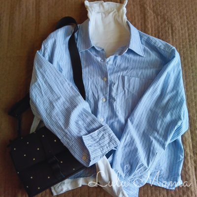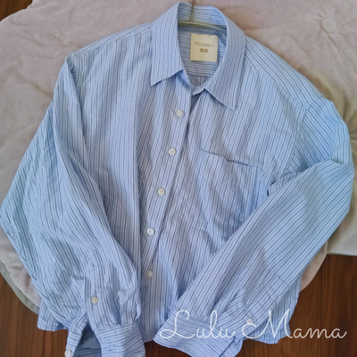 ショート丈の爽やか水色ストライプシャツ。ユニクロ×JWAコラボのです。