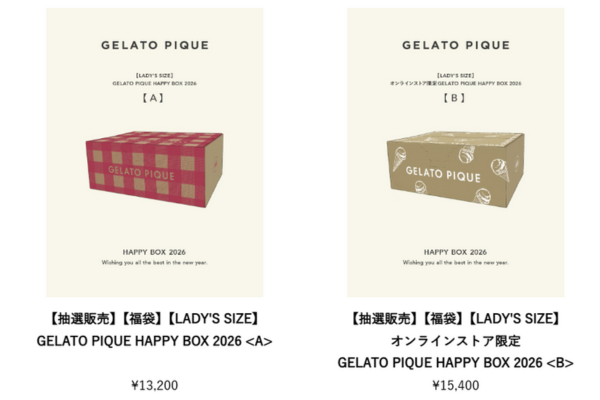 | 【LADY’S SIZE】オンラインストア限定 GELATO PIQUE HAPPY BOX 2026<B> | 15,400円 | もこもこニットやカットソーセットアップ、ワンピースなど人気アイテム5点。落ち着いたカラー。 |