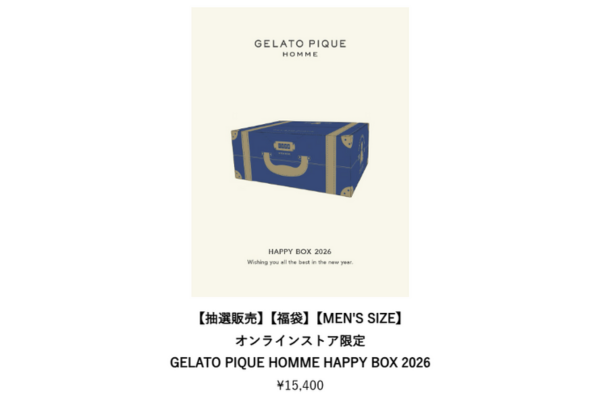 | 【MEN’S SIZE】オンラインストア限定 GELATO PIQUE HOMME HAPPY BOX 2026 | 15,400円 | もこもこニットのセットアップ、カットソーなど人気アイテム5点。落ち着いたカラー。(Mサイズ相当のフリーサイズ) |