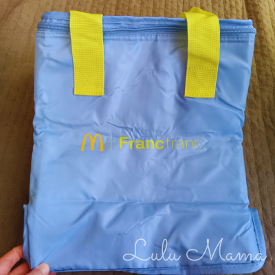 袋を開けてみました^^ビビッドすぎないブルーの色味が可愛いです。フランフラン感は……どうなんだろう?マクドナルドのキャラやビックマックスープジャーがパッと目に入ってくる感じなのであんまり感じなかったかな。でもおしゃれです。